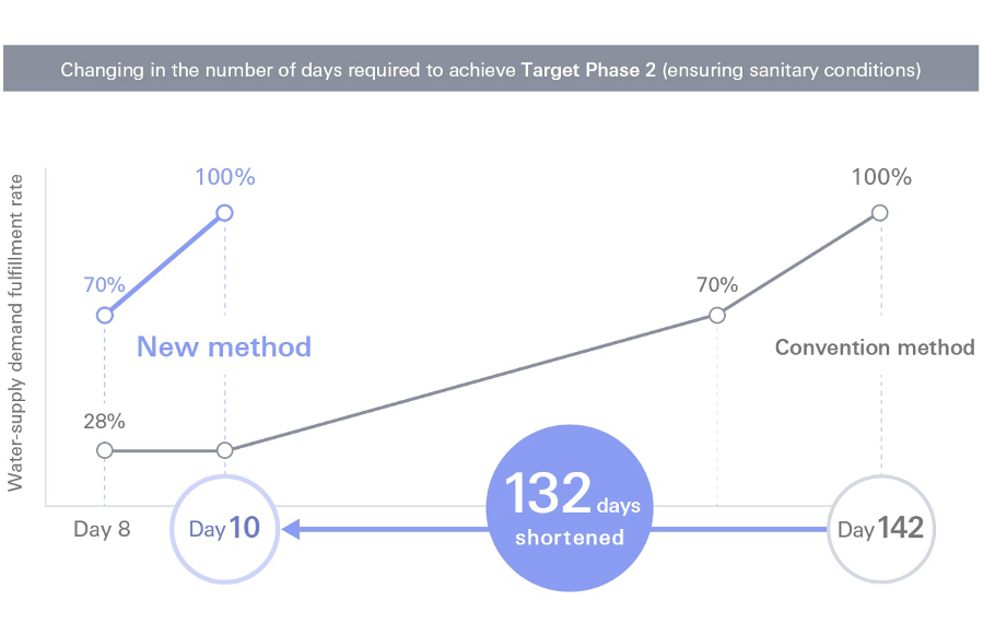 Furthermore, the time needed to satisfy evacuees’ water-supply demand was shortened dramatically: whereas conventional methods required 142 days from the disaster’s onset, the introduction of water-circulation systems reduced this to the 10th day after the disaster, a reduction of 132 days.