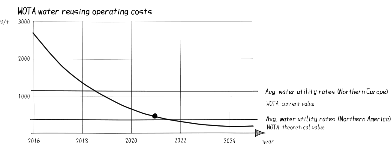 今、WOTAの水再生処理のコストは、北欧諸国の水道料金(10〜12USD/t)よりは安く、北米の水道料金(4〜5USD/t)よりはやや高い、という水準です。最終的には、2.2USD/tを実現することで、WOTAの製品は、世界のあらゆる場所で経済的にも合理的な選択肢となるのです。