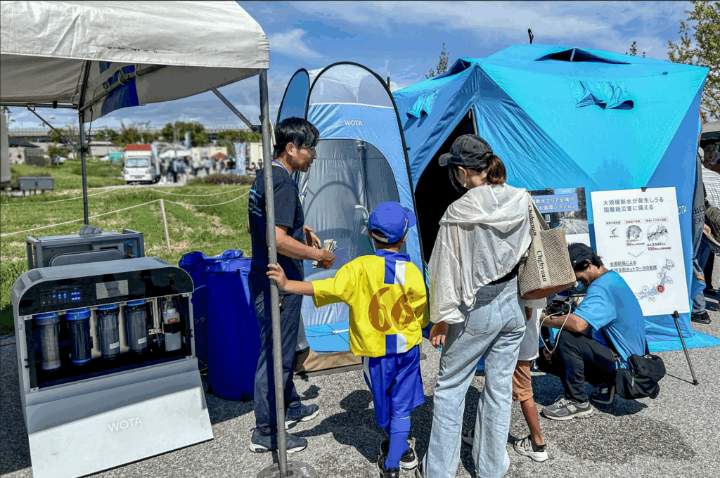 社会課題解決に向けて「官民連携」「市民共創」で取り組んできた泉大津市の取り組みを各種エリアを設け紹介する中で、WOTAは「防災エリア」にて災害断水時の応急給水を実現する、水循環型シャワー「WOTA BOX」を展示し、実際に来場者に体感いただくことで、災害時における生活用水確保の重要性やその課題についてご紹介しました。