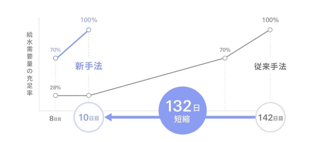 さらに、避難者の給水需要を満たすまでの期間は、従来手法では発災142日を要したのに対し、水循環システム導入により発災10日目へと短縮され、132日もの大幅な短縮が確認されました。