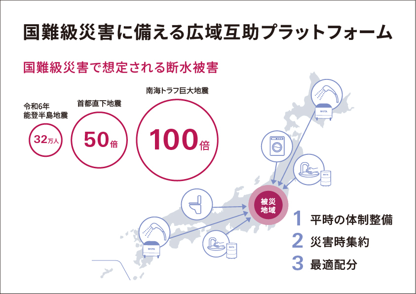 今後、想定される首都直下地震では能登半島地震の約50倍、南海トラフ巨大地震では約100倍規模の断水被害が想定されており、特に衛生環境および生活用水の確保は、被災自治体単独での対応は限界があります。こうした国難級災害に備え、都道府県を軸とした全国的な自治体間の相互支援体制をあらかじめ構築することは喫緊の課題です。WOTAはこの課題に対応するため、「水循環システム」を全国的に融通・配備可能とする本プラットフォームを構想しました。