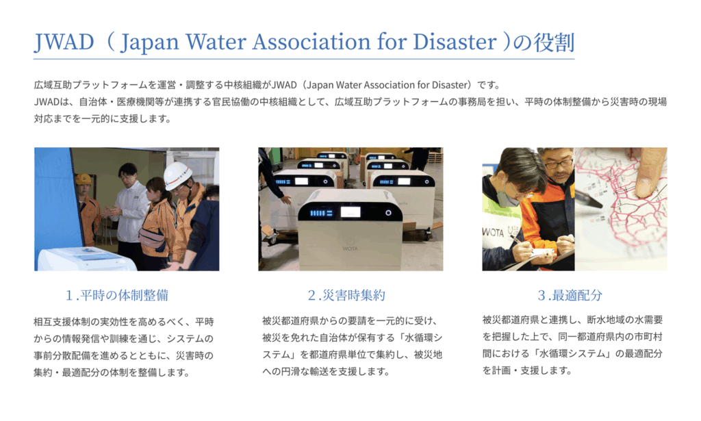 –WOTAは、生活用水資機材(「WOTA BOX」「WOSH」等)を活用した広域互助プラットフォーム「JWAD」を組織・運営し、被災自治体(受援団体)からの要請受付、被災していない自治体(応援団体)との調整、資機材の割り振り、および平時の事前配備調整を行う