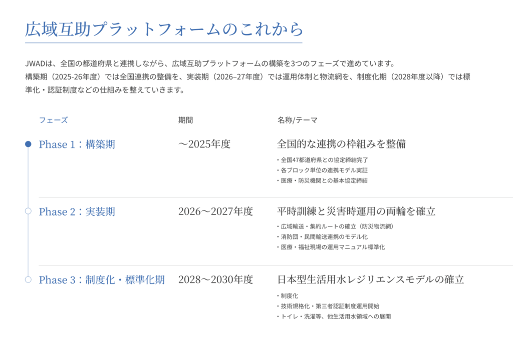JWADは全国の都道府県と連携し、本プラットフォームの構築を3段階のフェーズで推進します。構築期(2025〜26年)には全国的な連携の枠組みを整備し、実装期(2026〜27年)には平時の訓練と、物流を含む災害時運用の体制を立ち上げます。そして制度化・標準化期(2028年以降)においては生活用水資機材の規格化や認証制度を開始し、人々の衛生と尊厳を守る日本発の生活用水レジリエンスモデルを確立します。