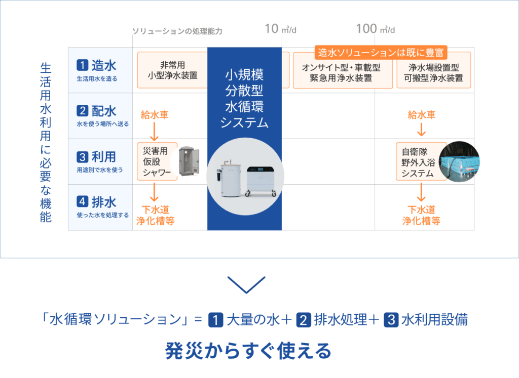 災害時の生活用水確保のため、現在多くの自治体が可搬型浄水装置(非常時に河川水や防火用水等を処理して安全な水をつくる装置の総称)の配備を検討・推進しています。しかし、こうした造水ソリューションのみでの問題解決は現実的ではありません。実際の災害現場においては、つくった水をどのようにして需要地に届け、どのような設備で使用し、使った後の排水をどのように処分するかということが大きな課題となるからです。