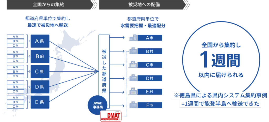 本プラットフォームを実際に運営し、総合的な調整を行うのが「JWAD(ジェイワッド/Japan Water Association for Disaster)」です。JWADは自治体や医療機関、民間企業が協働する官民連携の中核組織として、平時の体制整備から発災時の生活用水資機材の集約・配備までを一体的に担います。