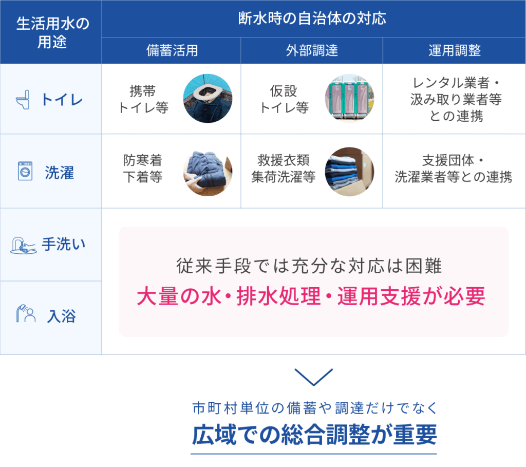 災害時の生活用水に関する課題は、用途によって異なります。トイレについては自治体備蓄品や民間レンタル品などの仮設トイレ資機材が充実してきており、自己処理型やトレーラー型など設備の多様化も進んでいるものの、設置や清掃、汚水汲み取りといった運用上の課題が残っています。炊事についてもキッチンカーの規制緩和が進んでいますが、衛生や防火に関しては現場での充分な管理が重要です。また洗濯に関しては、衣服の輸送支援(集荷クリーニングや救援衣料)が求められます。これらの用途の課題は、地域ごとのオペレーション体制の構築・強化によって解決できる見込みがあります。